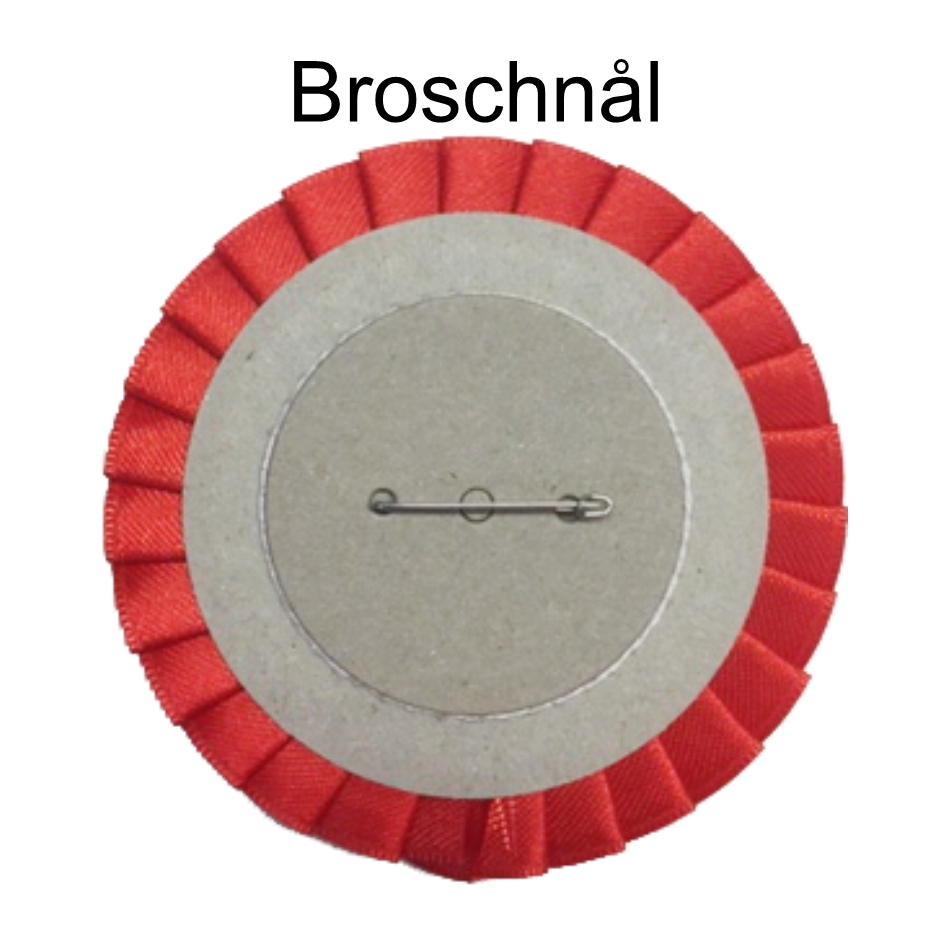 Rosett lite mindre med 2 kransar och dubbelt band. Hög bandkvalitet. Kan förses med broschnål istället för böjbar hake. Pappbricka med tryckt etikett ingår. Bandtryck tillkommer.
