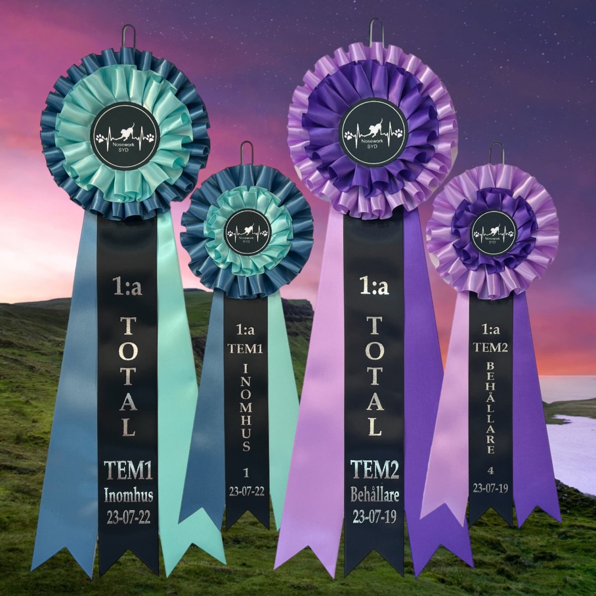 Rosett med 2 fluffiga kransar och 3 band. Hög bandkvalitet. Pappbricka med etikett ingår.
